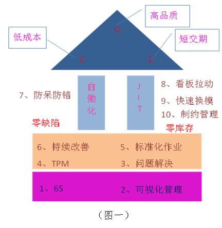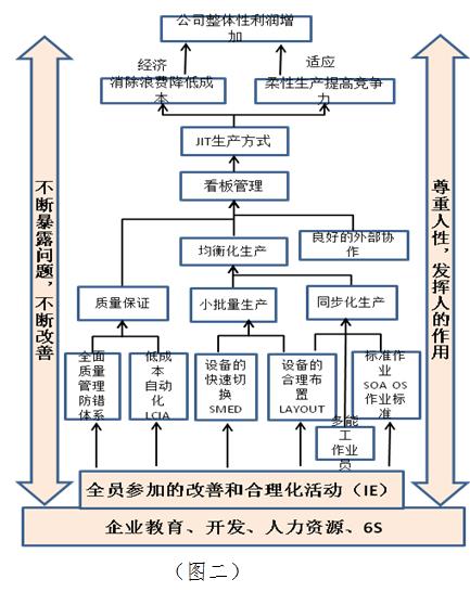 過去我們對(duì)TPS的系統(tǒng)認(rèn)識(shí),主要是從精益屋(圖一)里的所有工具知識(shí)開始,實(shí)施過程中我們也使用了很多的工具去解決現(xiàn)場(chǎng)問題,比如防呆防錯(cuò)、快速換模等。但由于全員參與的氛圍不夠,而且每期項(xiàng)目結(jié)束后沒有形成長(zhǎng)期的績(jī)效考核,導(dǎo)致經(jīng)過一段時(shí)間后,部分改善后的指標(biāo)又出現(xiàn)反彈。為了建立一套更符合我們匯美實(shí)業(yè)的TPS系統(tǒng)推行方法,使全員再好地參與到TPS當(dāng)中來,形成一致的改善方法和習(xí)慣,從而形成具有匯美特色的精益生產(chǎn)文化,我們?cè)俅闻c豐田企業(yè)文化進(jìn)行了對(duì)比,從《大野耐一語錄》中再次找到了另一個(gè)精益屋(圖二)。