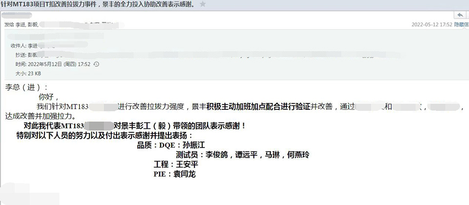 2022年5月12日,景豐收到了一封客戶的表揚郵件,客戶感謝景豐在MT183項目的全力投入和協助改善。客戶的這一份認可,有我們不懈的努力和堅持。
